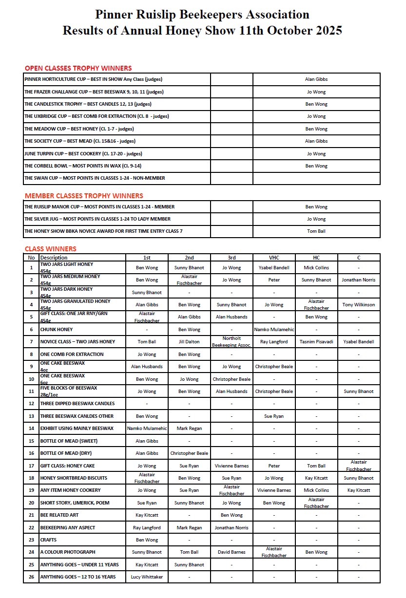The results from our Honey Show held on 11th October 2025 are below